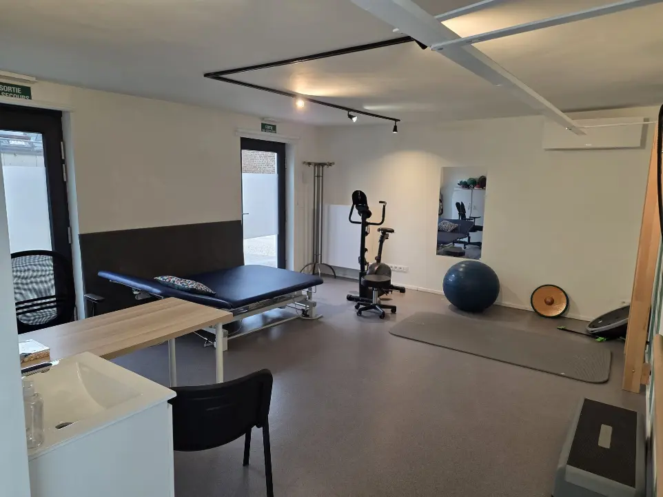 Cabinet de 30 m² aménagé d’un bureau, de chaises et d’armoire. La salle est dotée d’un lavabo, d’un miroir, de deux fenêtres murales. L’équipement kiné comprend une table de soin électrique, deux vélos électriques, des ballons, un espalier, une barre murale et des tapis.